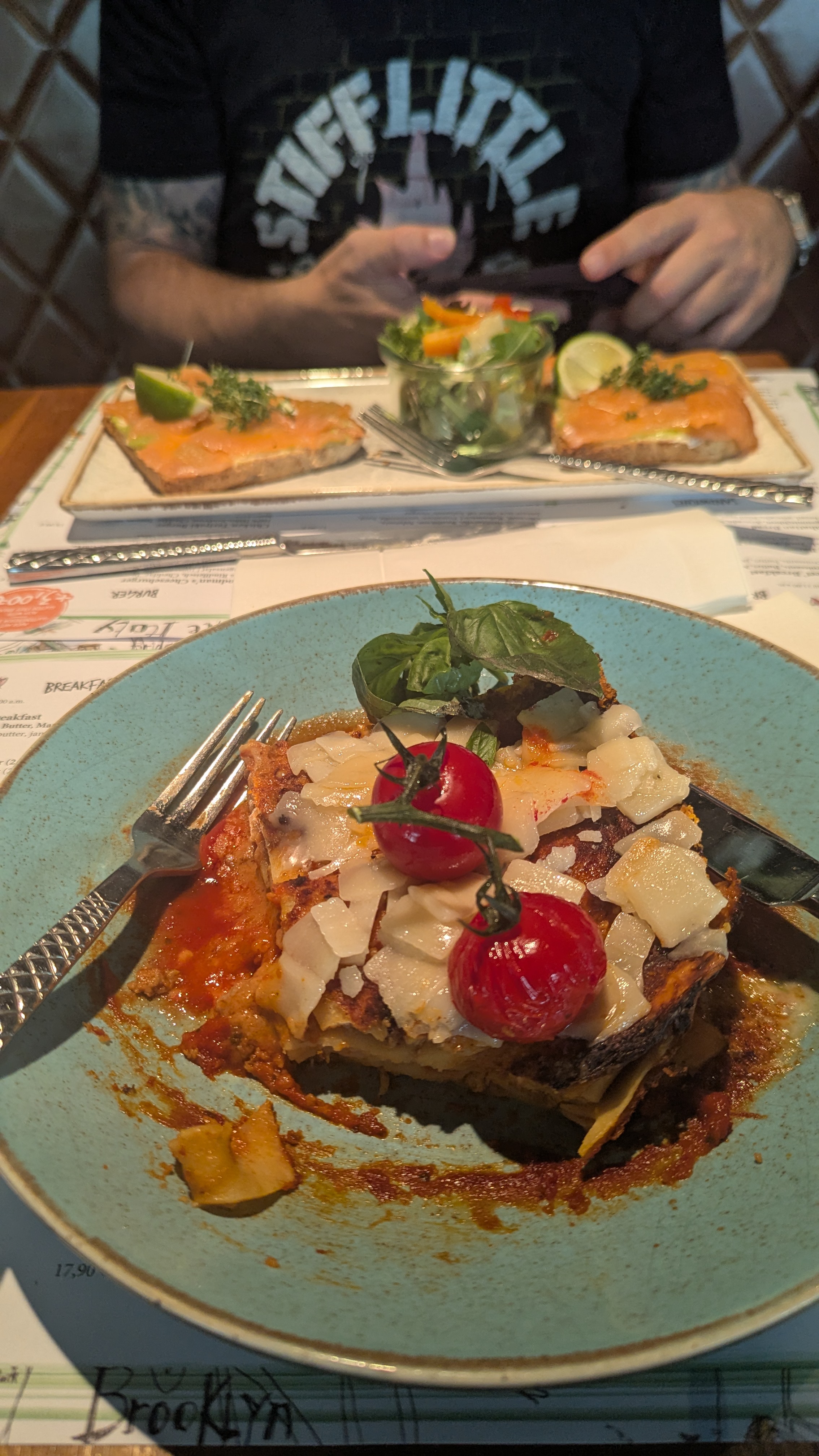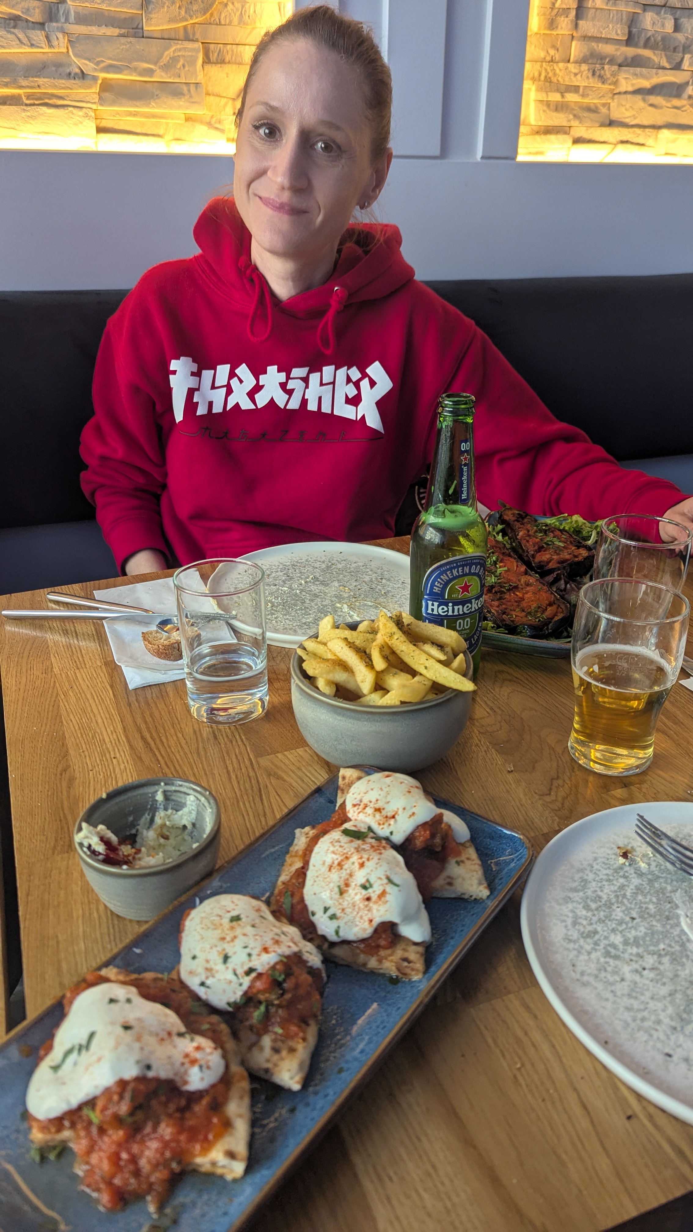 Budze durchstöberte die Google Maps Karte und stieß prompt auf ein gut bewertetes Restaurant namens „Simply Greek“, rund 15 Minuten zu Fuß und Bus von unserer Wohnung entfernt. Also nichts wie hin. Das Restaurant gefiel uns auf anhieb. Super freundliches Personal, nette Deko, eine übersichtliche Karte und die Gerichte, die zum Nachbartischen gebracht wurden, sahen alle super aus. Die Entscheidung war gefallen, hier wird gespeist! Unsere überbackene Auberginen, die Auswahl an Dips und die auf Pita Brot servierten Rindfleisch-Häppchen mit Joghurt und Tomatensauce waren super lecker. Und zwar so lecker, dass wir uns mit den Worten „see you tomorrow“ verabschiedeten und die Kellner noch darüber lachten.