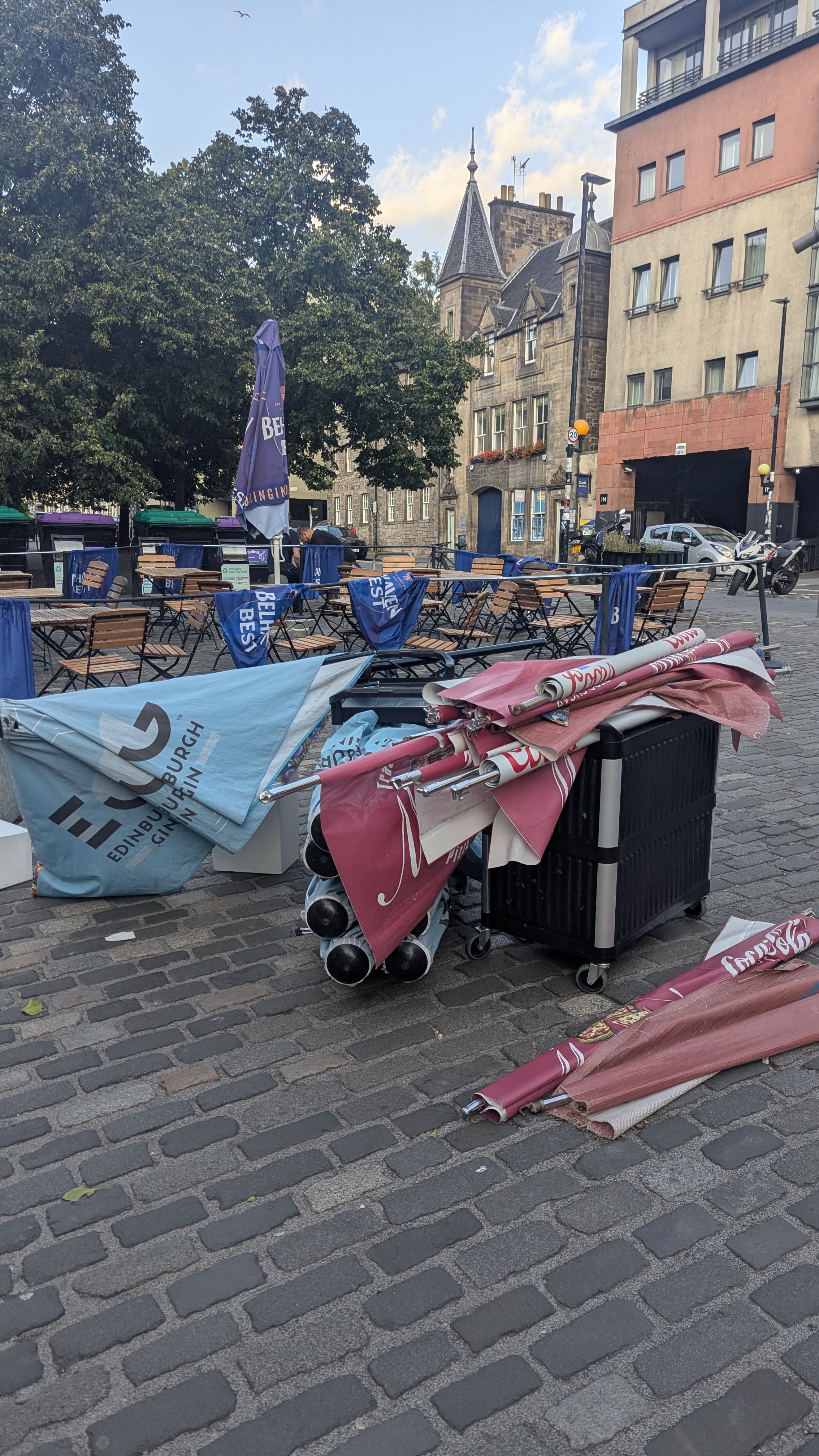 Heute Pubs, Biergärten, Restaurants. Ein beliebtes Ausgehviertel. Verlassene Einkaufswagen, kaputte Sonnenschirme, Müll auf dem Boden, Essensreste auf den Mauern, schlechte Graffitis, beklebte Laternen, zerrissene Werbebanner. Und das in alle mit Blick auf alte und tolle Gebäude. Sieht mit Blick auf das Umfeld und den Müll nicht viel anders aus als auf der Viehofer Straße in der Essener Innenstadt. Die nicht nur deshalb, aber auch, verrufen ist.
