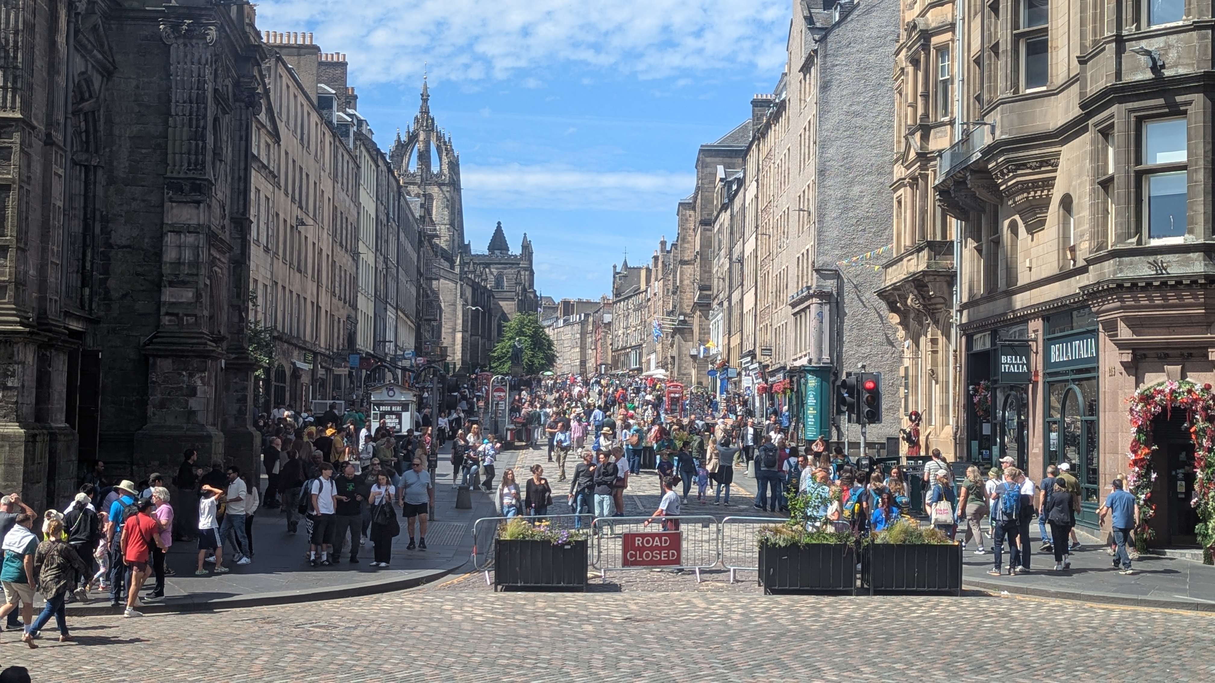 Gut gesättigt und 110 GBP ärmer, stiegen wir in den Bus zum Scott-Monument an der Princes Street. Von dort aus ging es bergauf über die Cockburn Street zur Royal Mile oder High Street, die in Old Town der schottischen Hauptstadt liegt. Vorbei an St. Giles Cathedral ging es weiter bergauf zur Edinburgh Castle, was für uns an den späten Abendstunden nicht mehr erreichbar war. Vor dem Schloß mitten auf dem Berg ist bereits eine riesige Bühne sowie mobile stadionähnliche Sitzplätze aufgebaut, sodass der Durchgang zum Schloß nur mit Tickets und geführten Touren möglich ist.