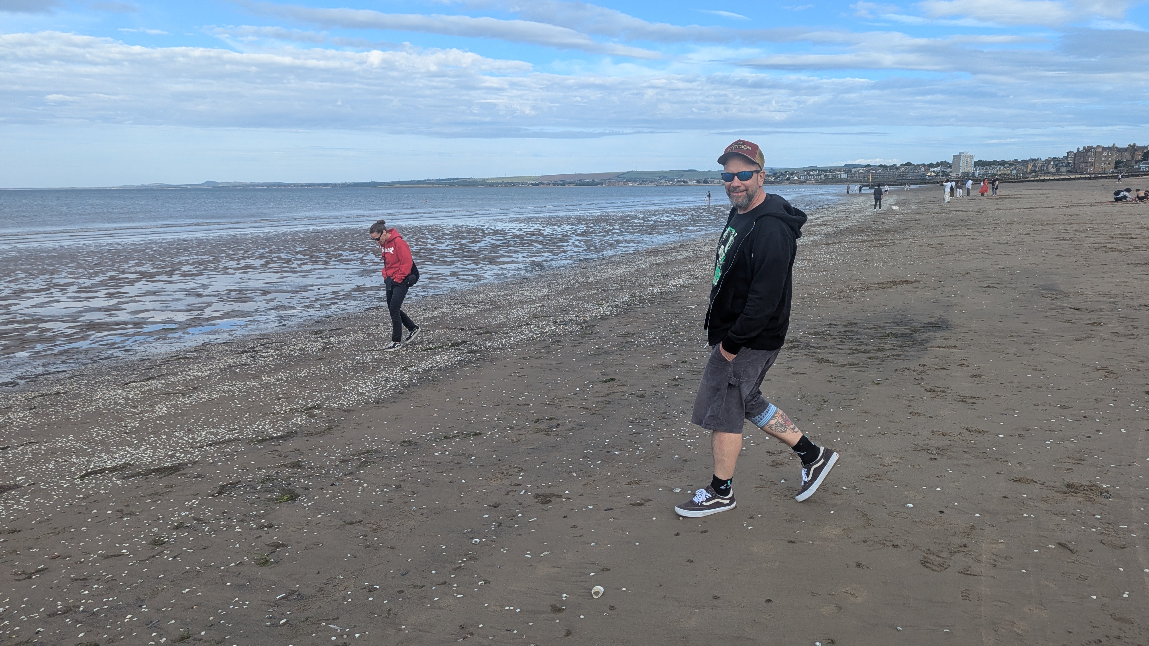 Gut gesättigt ging es mit der Linie 1 nach Seafield Edinburgh. Aber statt Strand erwarteten uns örtliche Autohändler und ein McDonalds. Die halbe Stunde Fußweg nach Portebello wollten wir uns sparen. Budzes Knie schmerzte und meine Füße qualmten. Nur Silke sprang nach einer kurzen Pipipause beim goldenen „M“ noch wie ein junges Reh über die Straße. Und so beschlossen wir mehrheitlich mit 2 zu 1 Stimmen uns ein Uber zu bestellen, dass dann auch fünf Minuten später eintraf. Etwa genauso lange dauerte der Ride zum Portebello Beach, der uns rund 6 Britische Pfund + zwei Pfund Trinkgeld kostete.