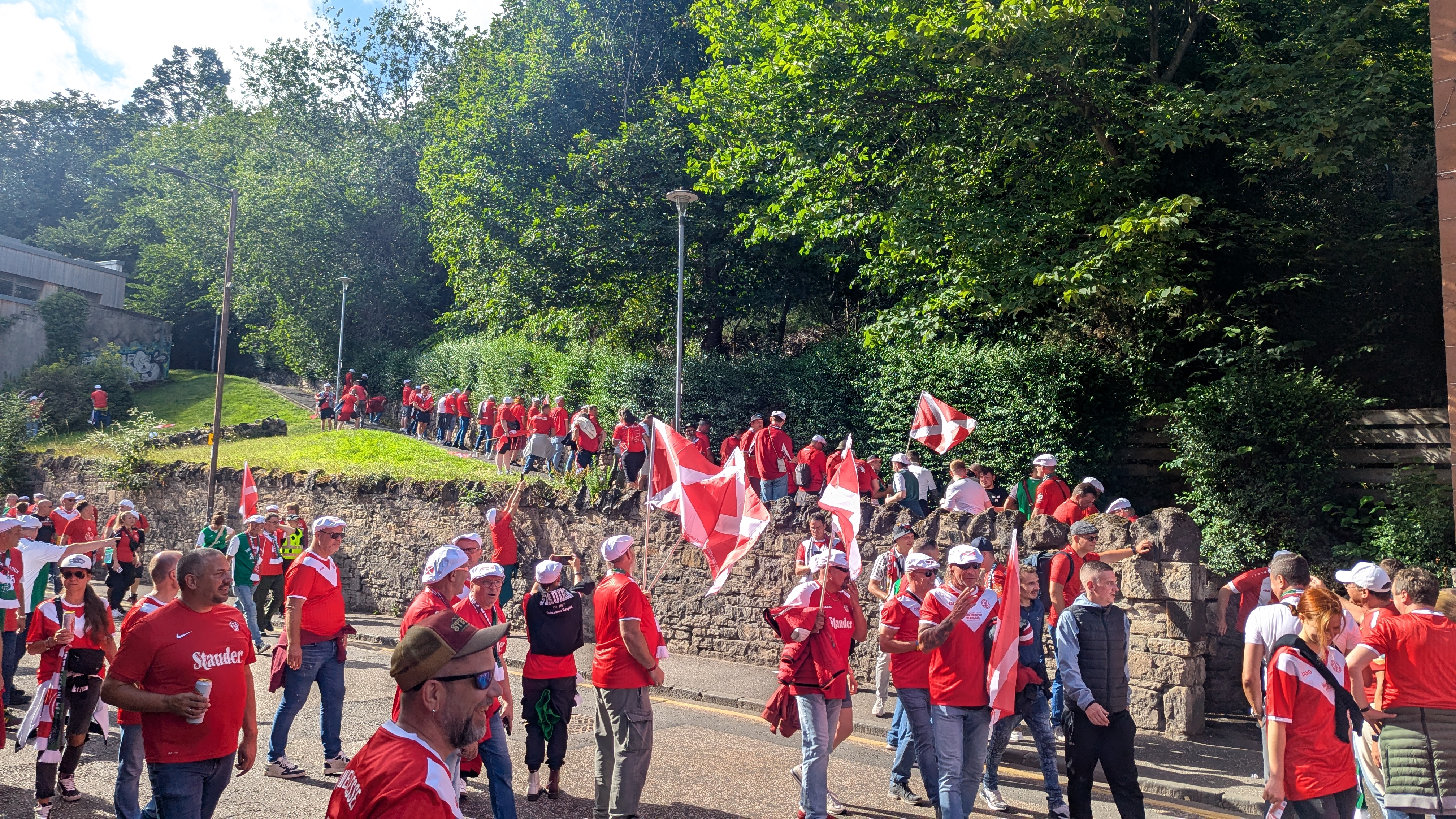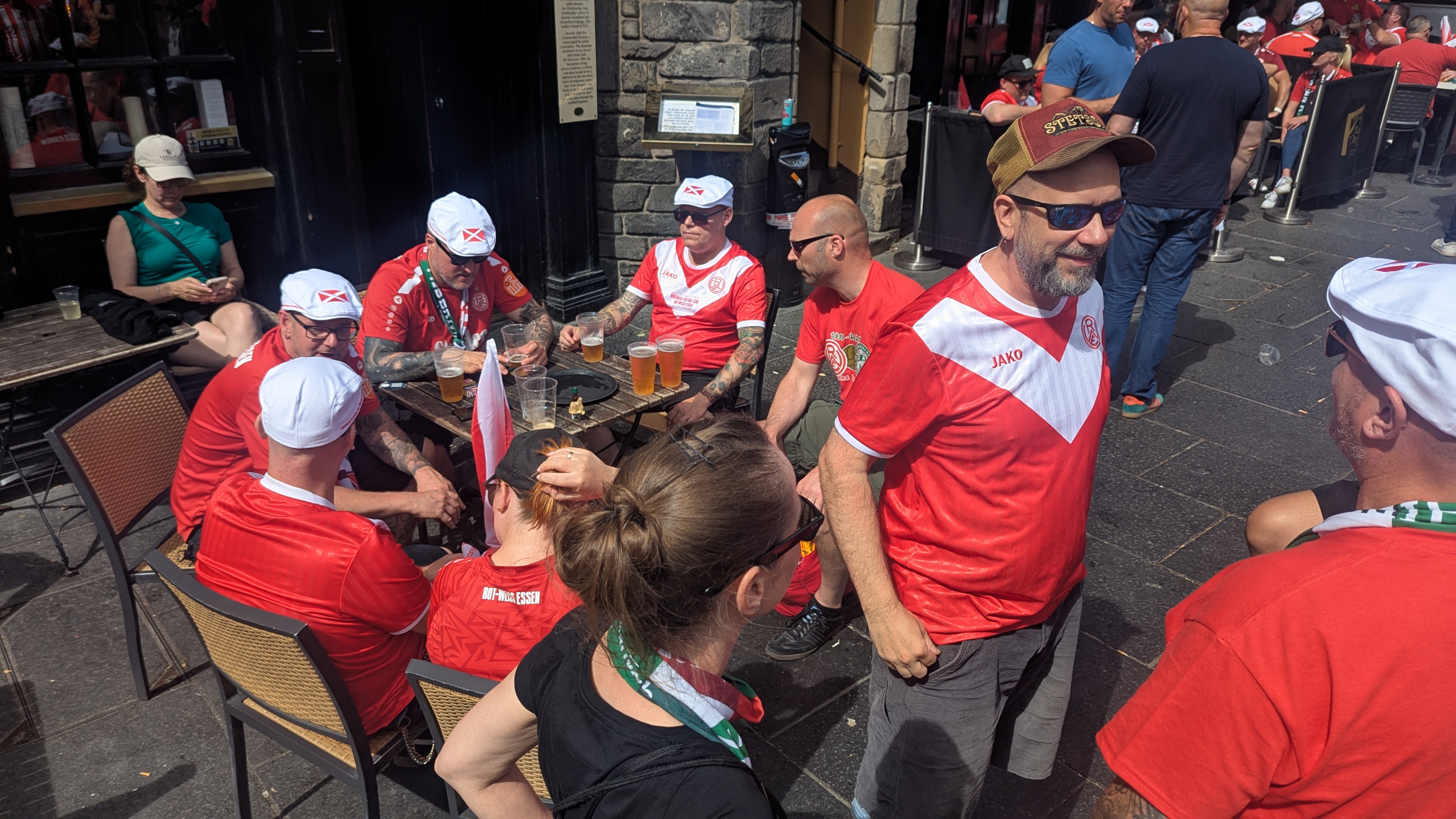 Ein paar Bier später machte sich der Trupp auf zur Easter Road. Es war ein beeindruckender lautstarker und vor allem friedlicher Fanmarsch von rund 2.000 RWE-Fans, der in Edinburgh Eindruck hinterlassen hatte.