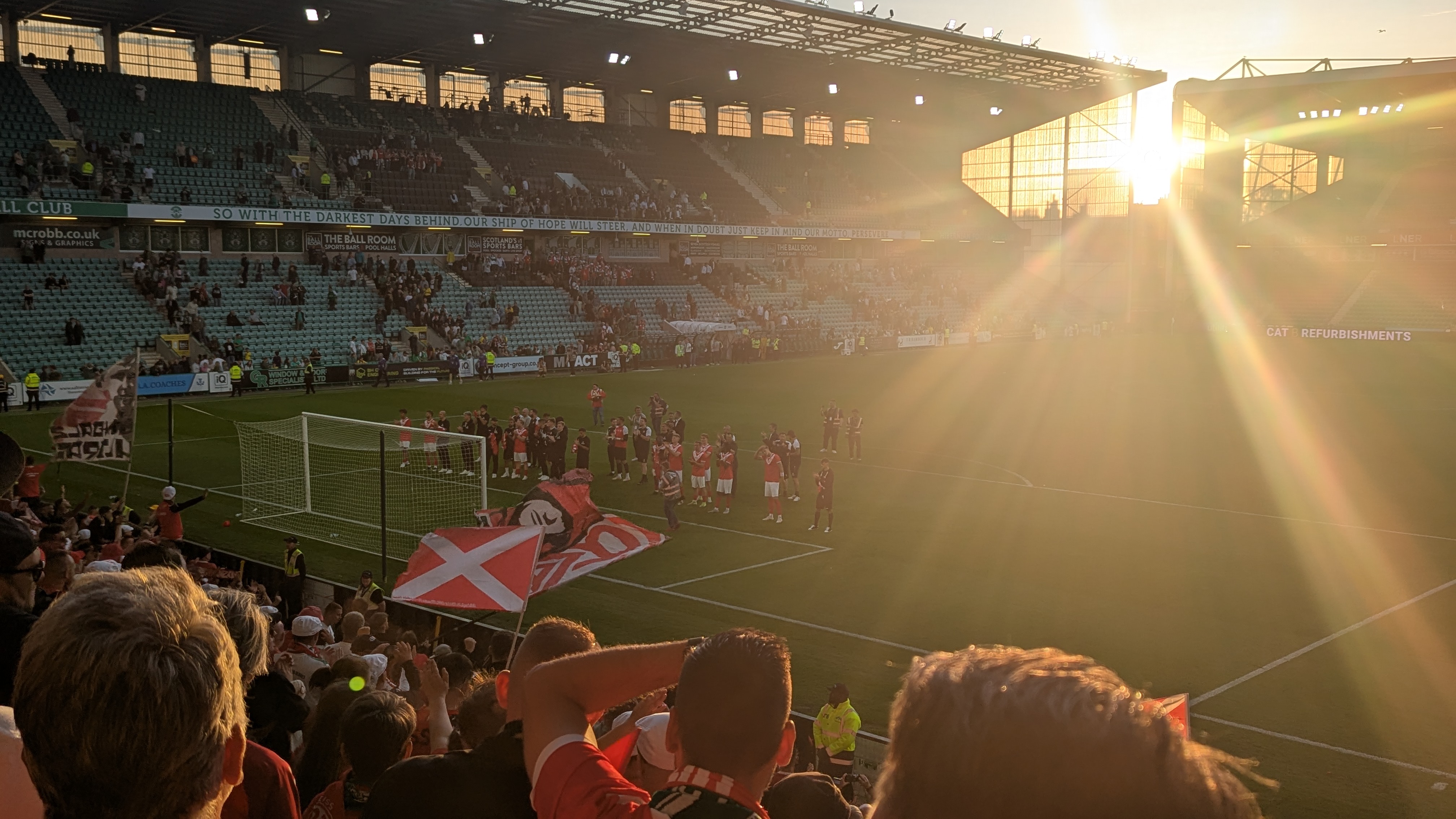 Am Abend war Anpfiff für die historische Neuauflage des ersten Europapokalspiels von RWE vor 70 Jahren gegen Hibernian FC im Jahr 1955. Die Stimmung im Stadion war super und es wurde 90 Minuten gefeiert. Die Hibs waren sehr erstaunt, welche Stimmung wir Rot-Weissen wir hier ablieferten, auch wenn das Spiel für uns in einer 3:2 Niederlage endete, aber das war auch völlig unerheblich. Unser körperliches Tagespensum war erreicht und unser Körper durch die heutigen Aktivitäten am Ende, deshalb verzichteten wir auf „Aftershow“ und feierten nicht mehr ausgelassen mit, sondern stolperten in unserer Herberge und ließen den Abend dort ausklingen.