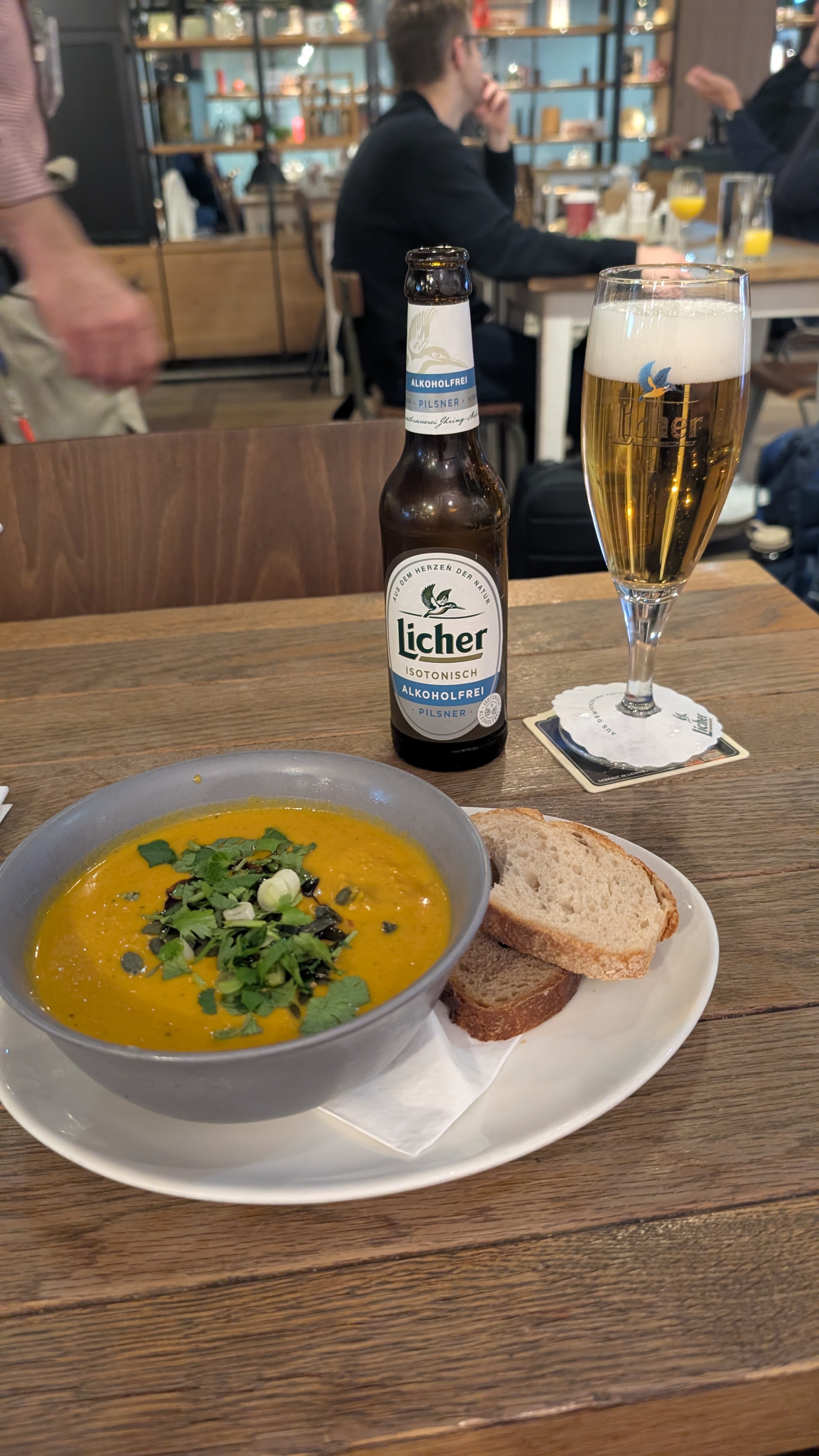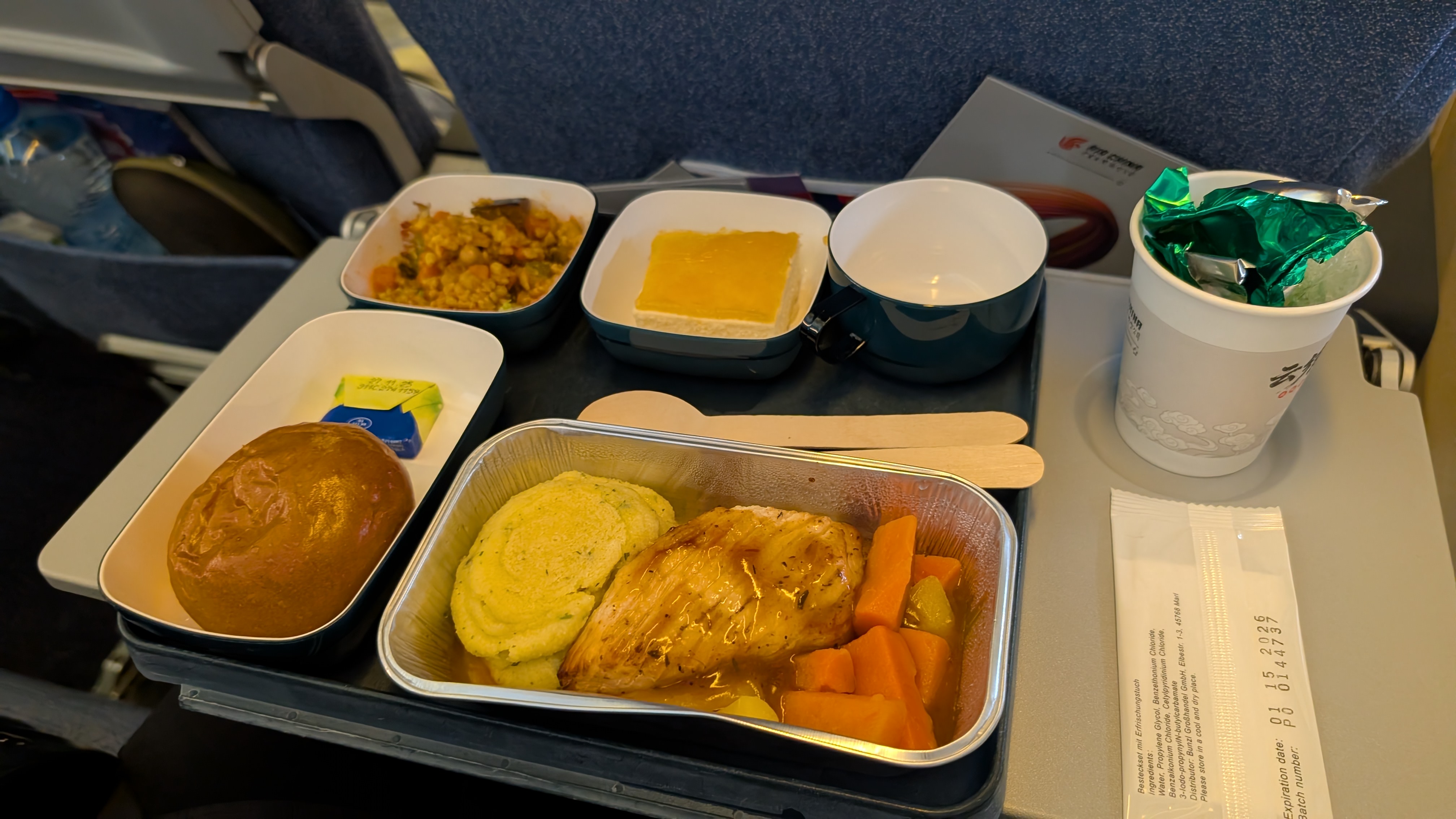 Der ICE fuhr mit 5 minütiger Verspätung am Bahnhof Flughafen Frankfurt ein und ich hatte entspannte 3 Stunden Zeit bis zum Boarding. Ich hatte mich entschieden einen kleinen Koffer neben dem Handgepäck aufzugeben. In der Schlange des Check-in lernten sich die ersten Traveller flüchtig kennen. Für zwei junge Mädels ging es nach Bangkok und Inselhopping rund um Phuket für die nächsten drei Wochen, ein anderes Pärchen flog wie ich mit dem Flug CA966 nach Tokio… mit Umstieg in Peking. Da mein Koffer in Peking durchgecheckt wurde, erhielt ich direkt zwei Boarding-Tickets und konnte so hoffentlich entspannt den Transfer zum Anschlussflug erreichen. Mal sehen… Mein Kissen hatte ich vergessen, aber ich war nicht bereit 55 Euro ein halbwegs „festes“ Nackenkissen im Flughafenshop auszugeben. Fast für das gleiche Geld verbrachte ich die nächsten zwei Stunden im Restaurant Deli Bros in Terminal 1, am Gate B. Kürbissüppchen, Bierchen, Milchkaffee und Snacks waren ein gute Frühstücksalternative.