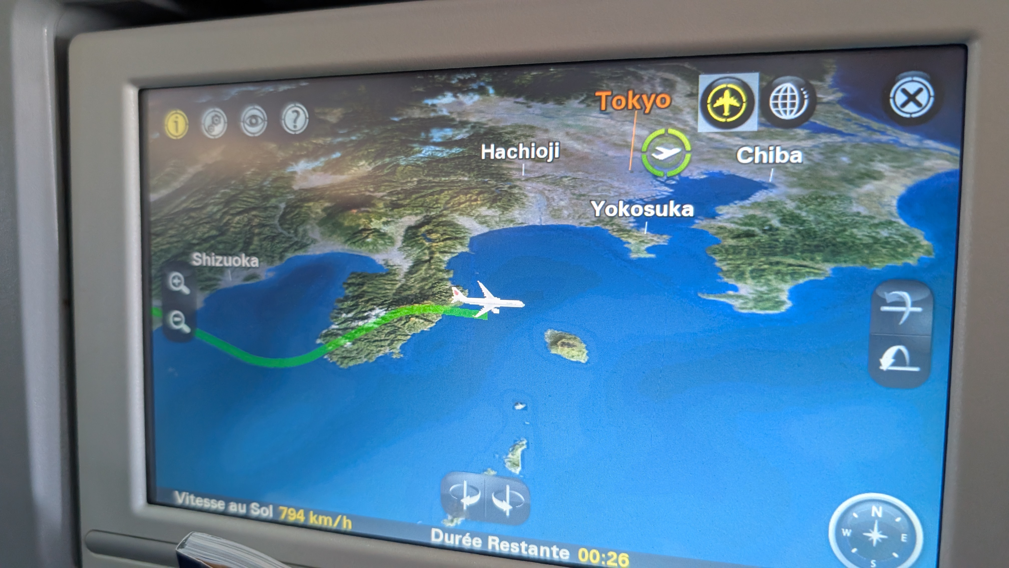 Vom Hunger getrieben, oder besser gesagt von der Angst, in zwei Stunden Hunger zu bekommen, ließ ich mich dazu verleiten Chicken Wraps zu ordern. Zwei Bisse später landete die Packung im Mülleimer. Absolut ungenießbar. 15 Minuten verspätet startete dann der Air China Flug nach Tokio. Gleiche Fluggesellschaft, strengere regeln. Tablets auch im Flightmodus nicht erlaubt, Handy schon. 8-9 mal streifte die Crew vor Start durch die Gänge, kontrollierte die Nutzung von mobile devices, Gurte usw. Fast jeder wurde einmal aufgefordert, Geräte auszuschalten oder den Gurt enger zu schnallen.