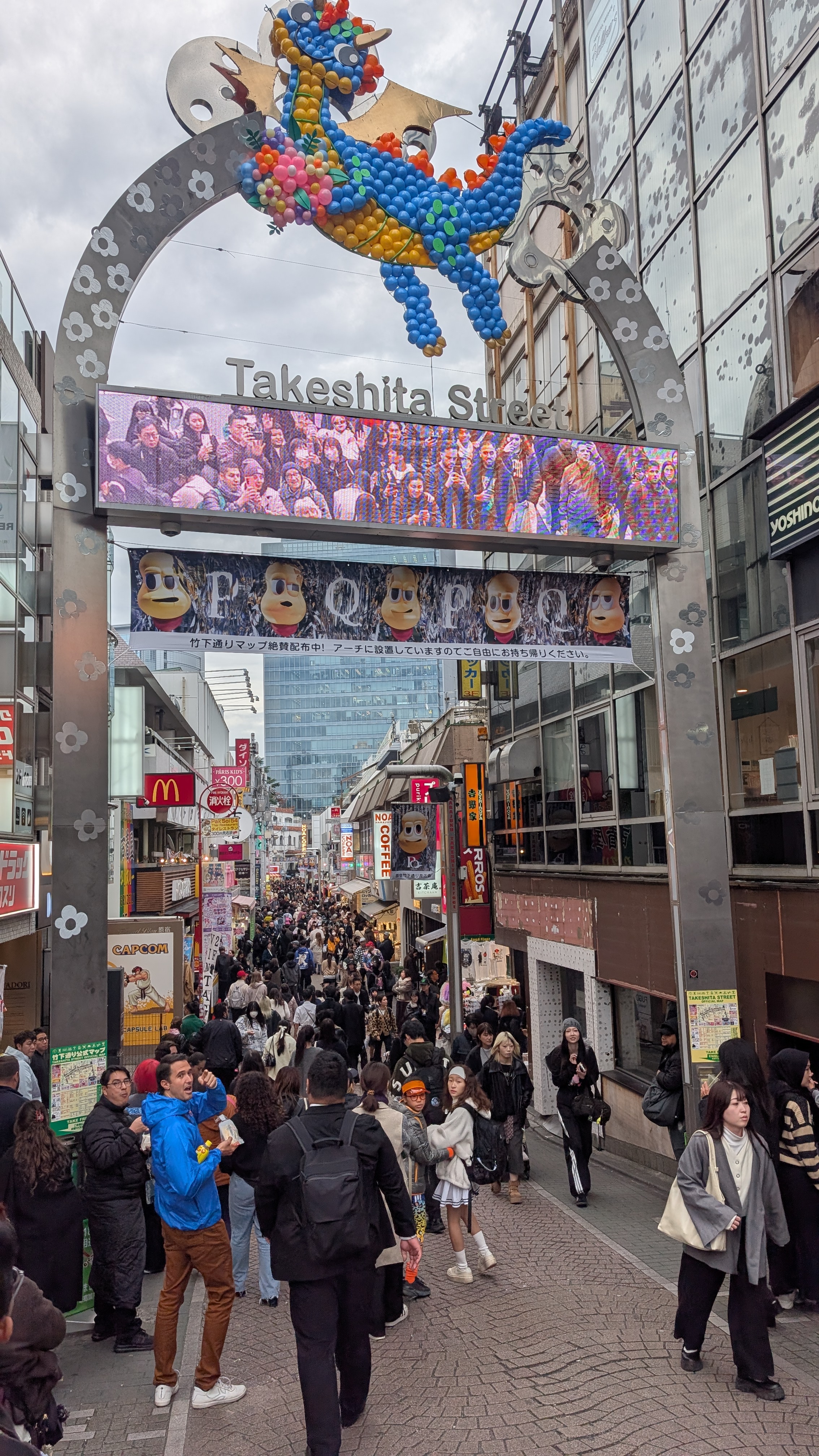 Nur ein paar Gehminuten weiter schielte ich in eineStraße, in der sich unzählige Leute tummelten. Die Takeshita Street: die wohl wohl verrückteste Straße Tokios. Klimbim überall, verrückte Essenshops, Hundekuschel- und MiniPig Bars überfüllte Capsule Toys Shops.
