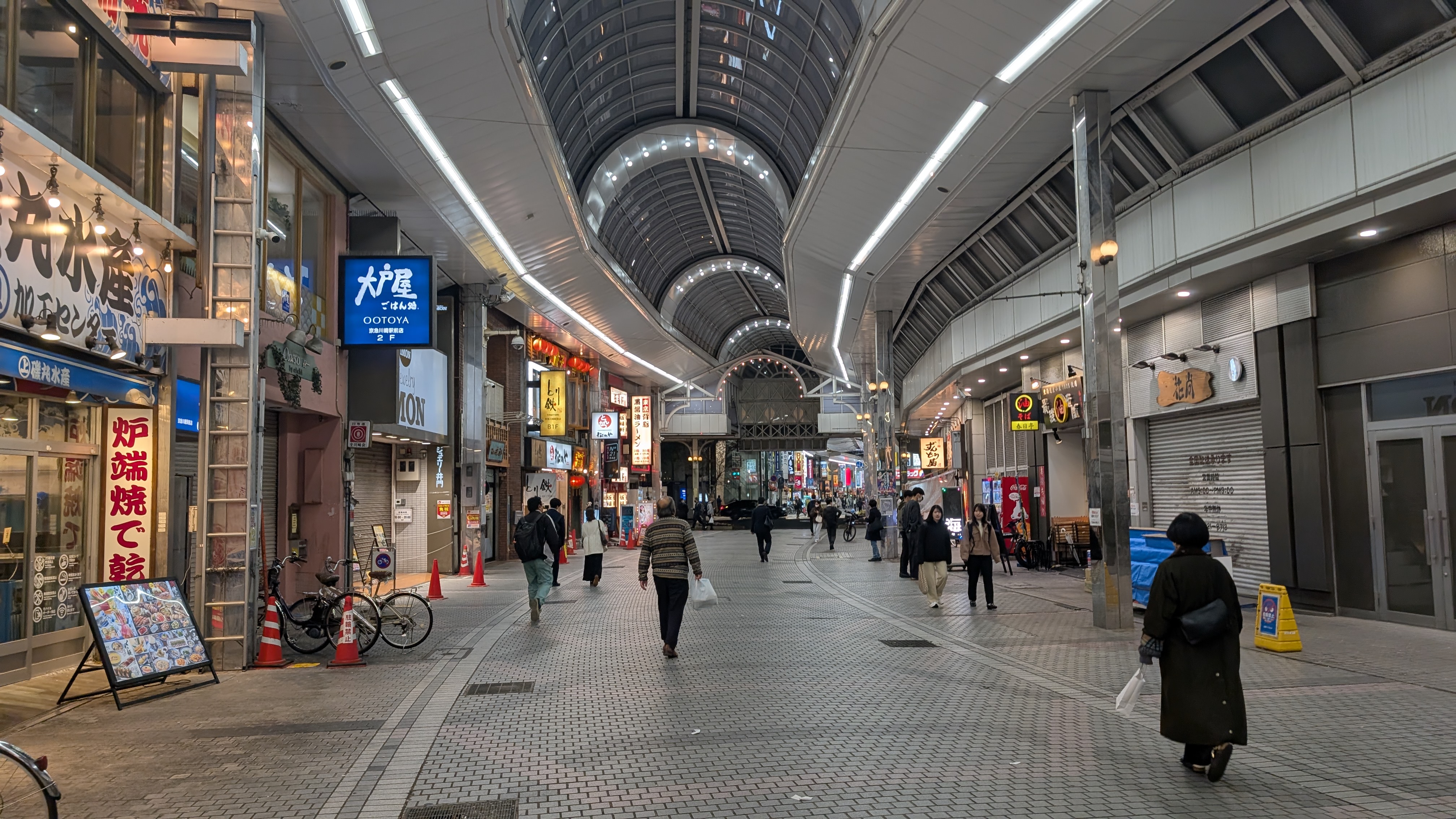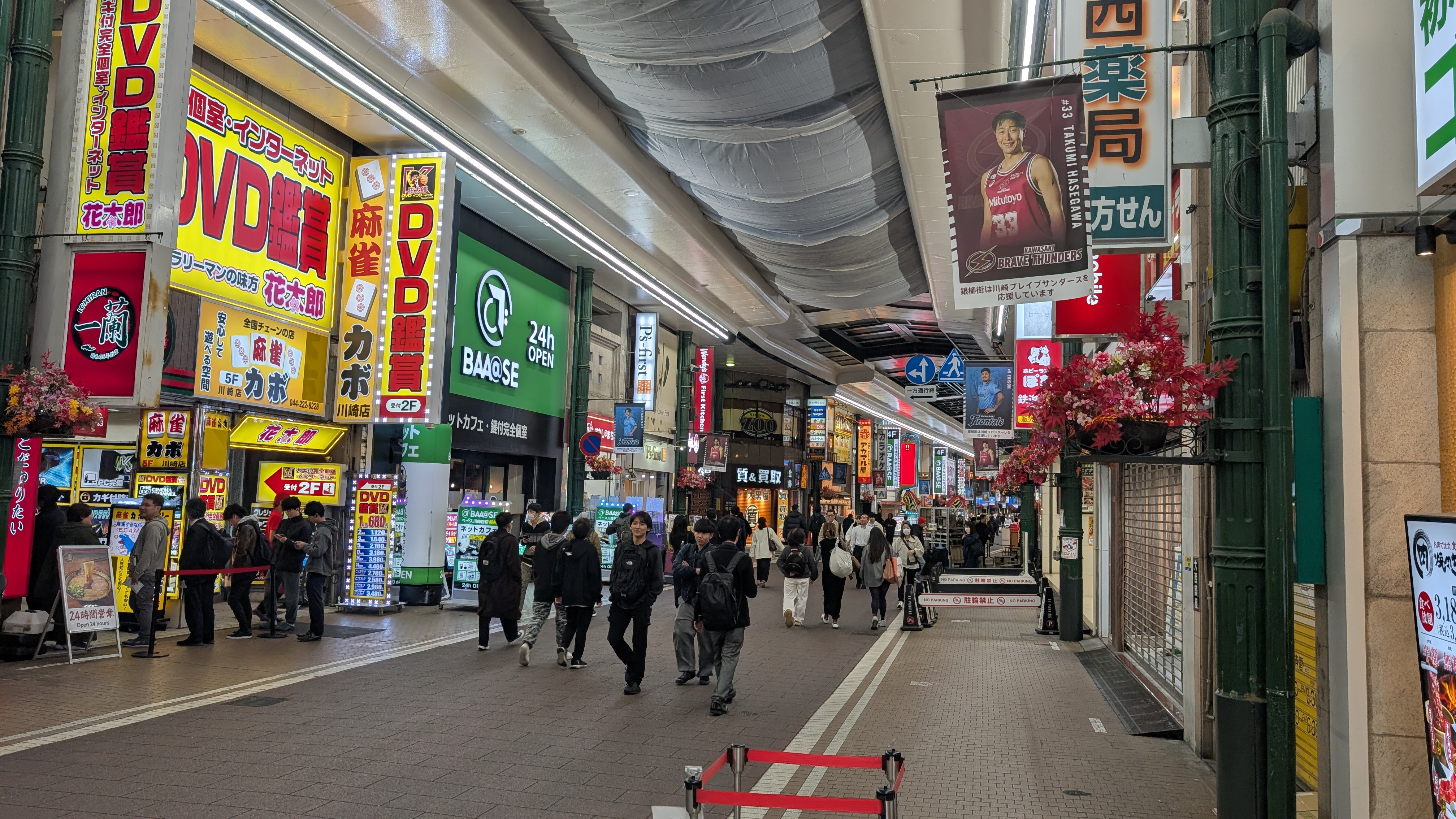 Ich schlich durch die dunklen Straßen zurück auf eine schrill beleuchtete Einkaufsstraße auf der Suche nach…. nichts. Ich stolperte also in die Ginryu-gai, eine Einkaufspassage am Rande des Bahnhofs über mehrere hundert Meter lang und Shops auf beiden Seiten. Und weil ich auch dort nichts gefunden hatte, ging’s nach zwei Stunden wieder in Richtung Innenstadt.