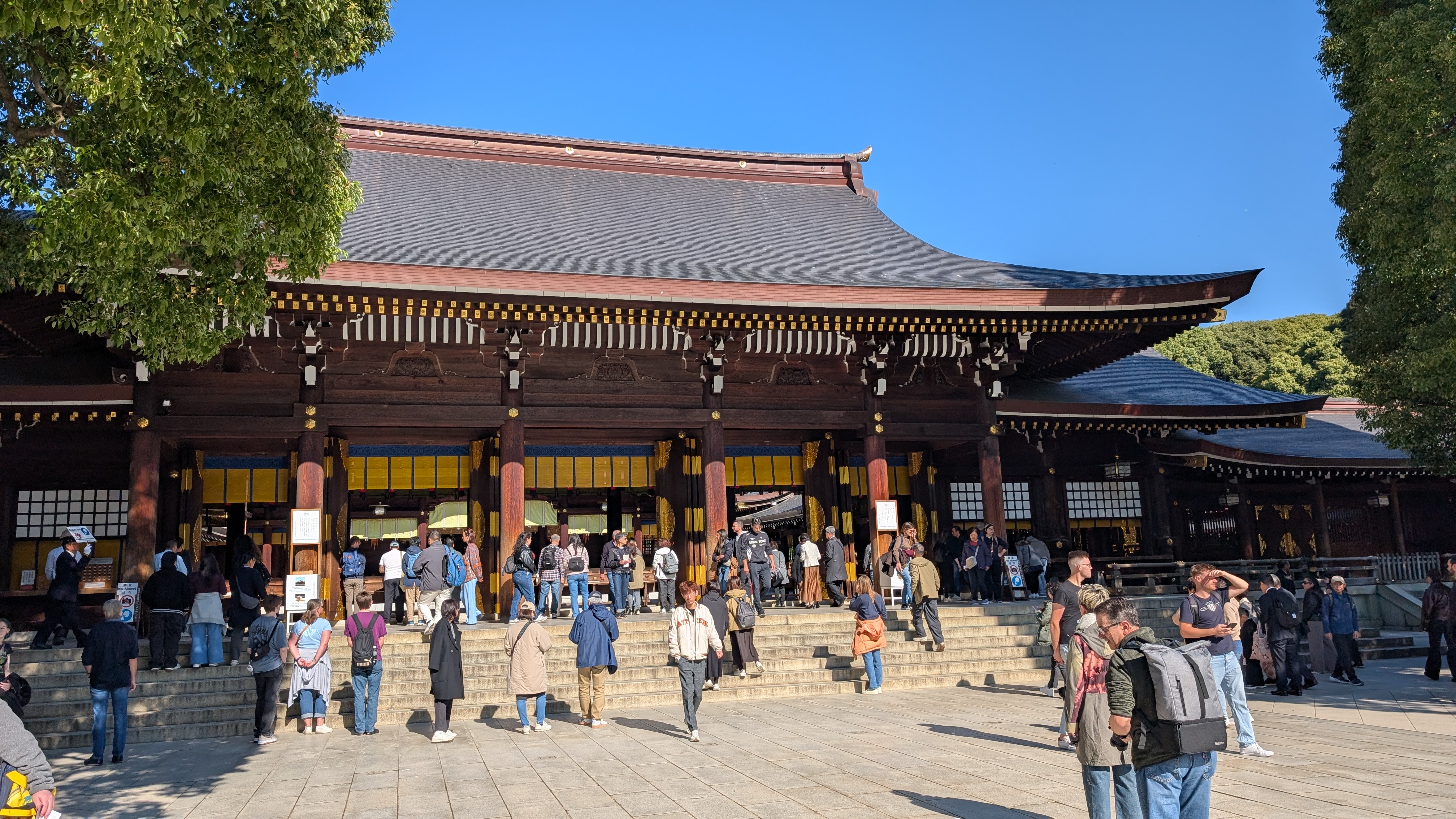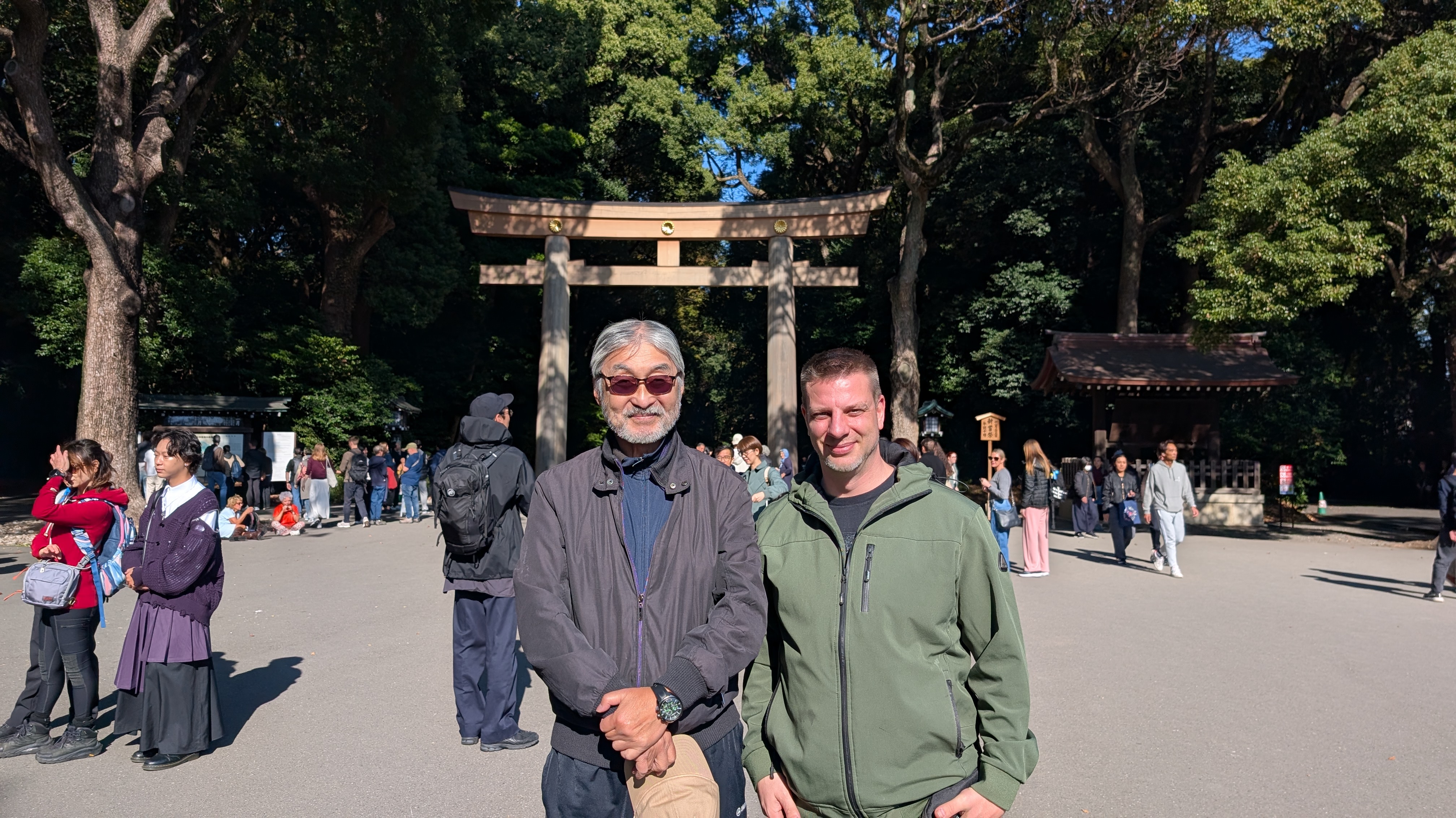 Mit meinem Stadtführer an der Seite erfuhr ich nicht nur mehr über den Mann am Parkeingang, der „Sweet Potatoes“ verkaufte, sondern auch, dass ich mich am Eingang zum Park verbeugen musste und nie durch die Mitte des hölzerne Torii gehen sollte, sondern immer ganz nah am innenliegenden Rand eines der Pfähle. Der mittlere Bereich sei nur den Göttern vorbehalten, von denen man heute allerdings hunderte in Form von Touristen sah, die diese Information nicht hatten. Nachdem wir noch kurz mit Kenjis Partnerin telefoniert und ich mich per Videocall vorgestellt hatte, spazierten wir zum Schrein selbst.