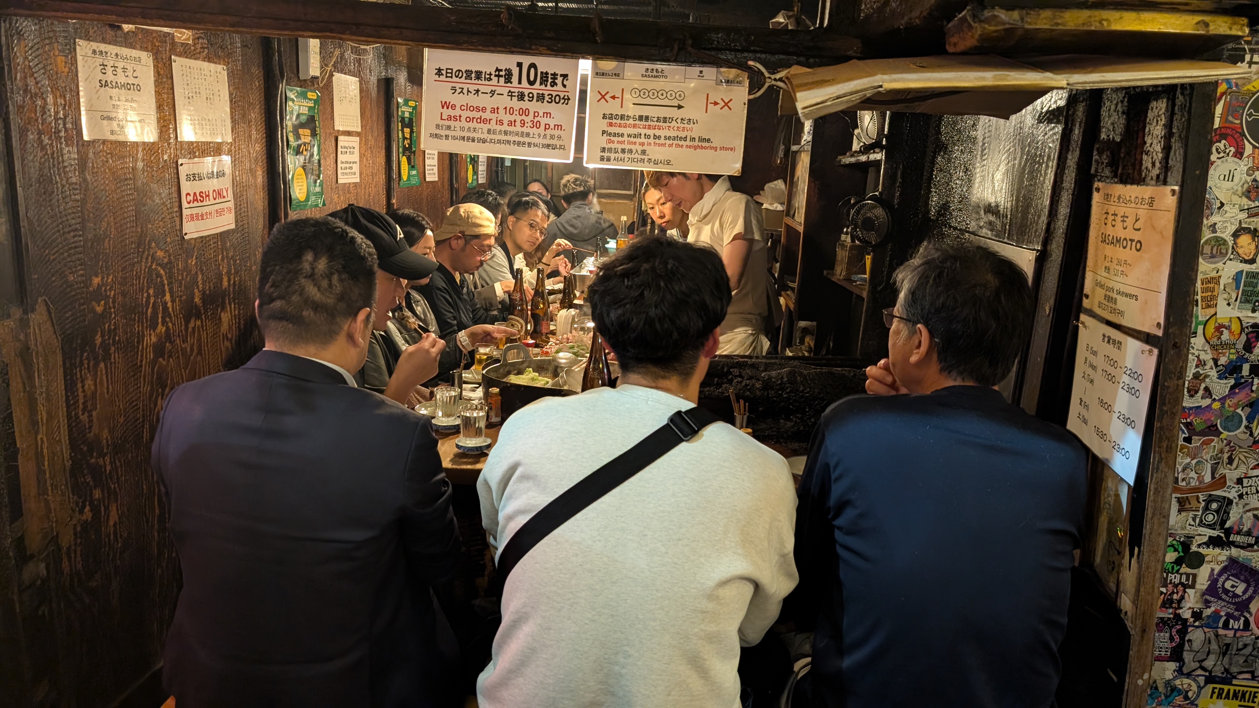 Aus jeder Kneipe duftete das Essen und es war voll. In keiner Kneipe sah ich einen freien Platz, aber dafür viele gutgelaunte Gesichter, die es sich bei Yakitoro, Hühnchenfleisch auf Spieß und Bier, gutgehen ließen. Tische gibt es übrigens nicht, hier sitzt man dicht an dicht zusammen am Tresen, was auch genau die Atmosphäre ausmacht. Wer hier noch eine Platz bekommen will, sollte allerdings vor 18 Uhr hier sein.