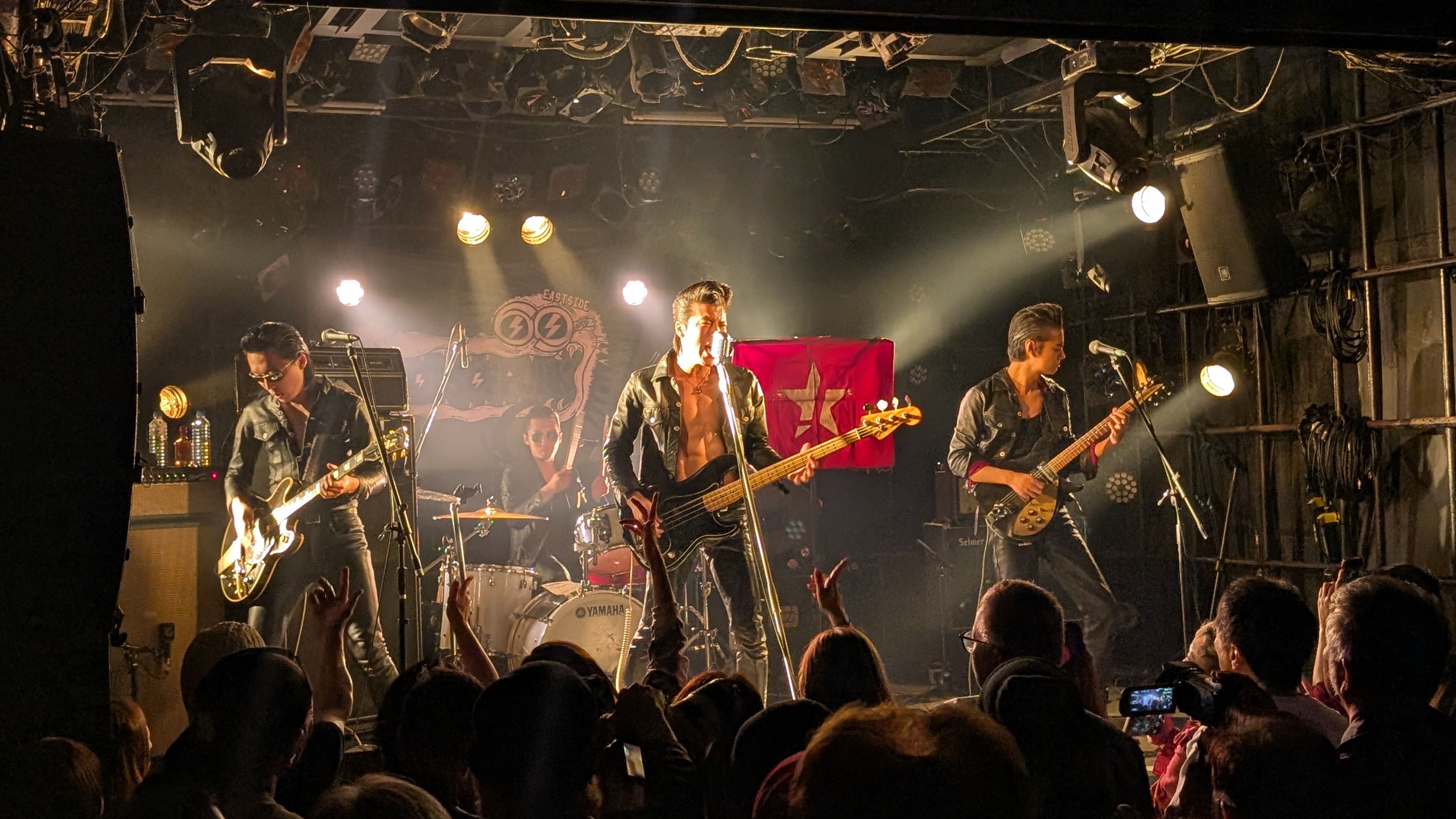 Sänger Kamasaka lieferte eine dreckige Punkrockshow ab und selbst die älteren Rockabillys sprangen mit Enthusiasmus und starken Glauben an ihre Knochen von der Bühne. Der Ablauf gut organisiert. 30 Minuten volle Power für jede Band, 10 Minuten Umbau und Soundcheck und weiter ging es.
