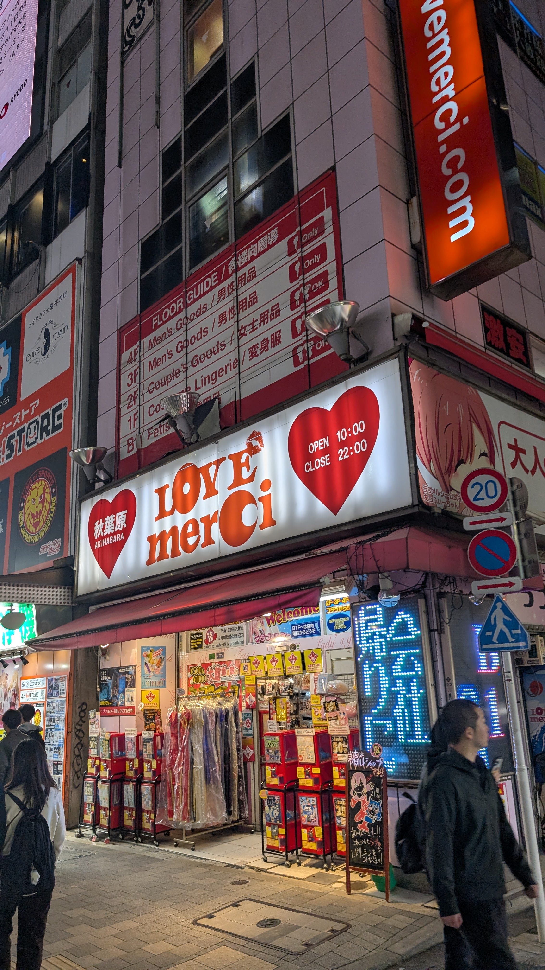 Zu guter Letzt schaute ich mir noch den Love Merci Shop an, der auf vier Etagen alles ausstellt, was die Erotikbranche so zu bieten hat, als Ware in den Regalen stehen hat. Die oberen zwei Etagen sind für Frauen nicht zugänglich. Neben lebensgrossen Sexpuppen gibts hier ein paar außergewöhnliche Spielzeuge, die dann auch mich überraschten und die wohl doch eher den perversen Neigungen des männlichen Geschlechts an die Hand gegeben werden. Irgendwann war aber auch mir das Bling Bling zuviel und nachdem ich den 10. Flyer eines Maid Cafés von einer der jungen Mädels am Strassenrand zugesteckt bekommen hatte, machte ich nicht auf den Weg ins nächste Viertel.