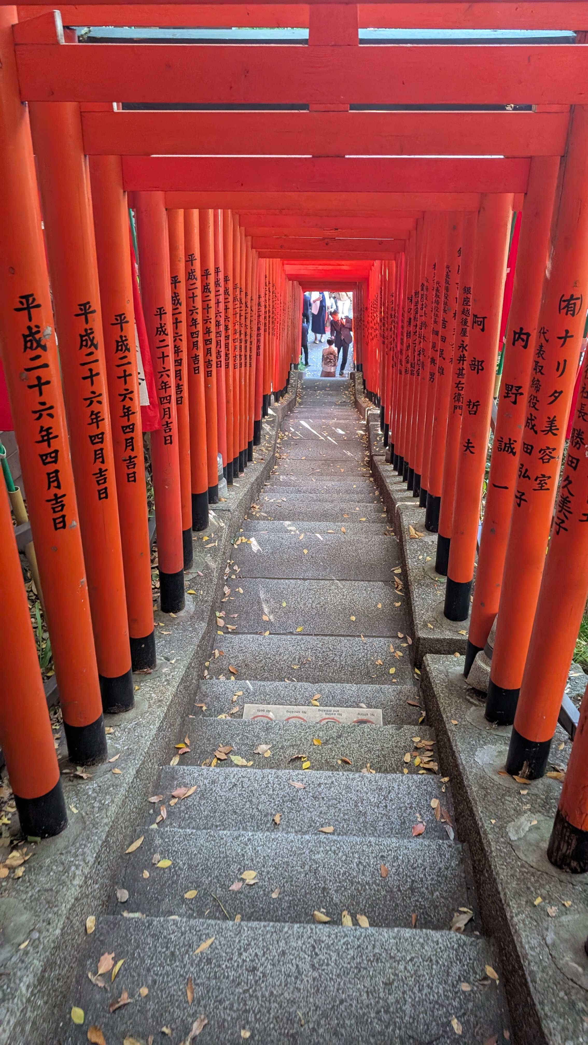 Da ich keine Münze bei mir hatte, blieb mir das Ritual zum Beten verwehrt, aber es war trotzdem spannend, der Tradition zuzusehen. Wie verließen den Park am anderen Ende und Kenji betete wie jeden Tag am Torii, während ich abseits einfach still da stand.