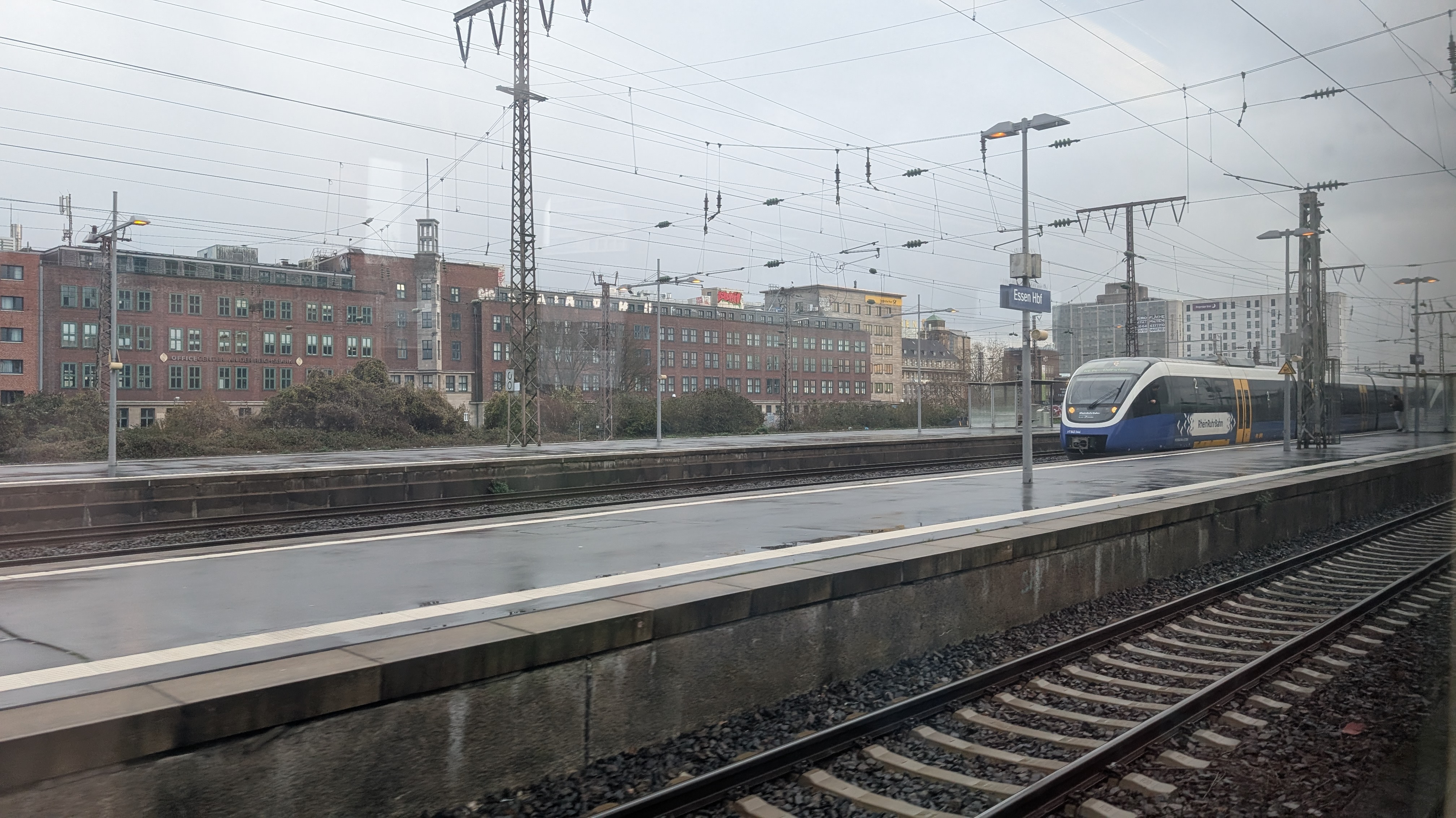 Noch schnell die Butterbrote für die Schule geschmiert. Die Sachen in den Handgepäckdrucksack geworfen und schon erinnerte mich die UBER App daran, dass mein Fahrer vor der Tür steht. Mohamad begrüßte mich mit „Hallo Stefan“, nahm mir den den kleinen Trolli und den Rucksack ab und schmiss die arabische Musik auf partylautstärke an. Der Gurt ließ sich nicht flexibel einstellen, da das Gurtband hakte, aber dank meiner seit einer Woche laufenden Shake-Abnehmkur, schafften wir es gemeinsam den Gurt einzuhaken. Ein erster Erfolg des Abnehmplans über den ich mich Luft japsend freute, da der Gurt doch noch sehr Straff saß. Aber nochmal abschnallen, um die Jacke auszuziehen und noch einen Zentimeter Spielraum zum ausatmen zu gewinnen, war mir zu umständlich. Ohne größere Verspätung trotz des Weges durch die Baustellenstadt, erreichte ich überpünktlich den Essener Hbf.